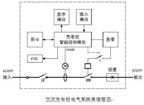 交流充电桩:采用传导方式通过人机交互操作界面,为具有车载充电机的电动汽车提供交流电源装置。工作原理是通过人机交互显示屏输入信息,控制导通主回路电路,给车载充电机供电,并设有监控、计量、保护、通信等模块。