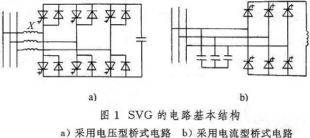 根据直流侧储能元件的不同,SVG分为采用电压型桥式电路和电流型桥式电路两种类型,其电路基本结构如图1a和1b所示,分别采用电容和电感两种不同的储能元件。对电压型桥式电路,还需再串联上连接电抗器才能并入电网;对电流型桥式电路,还需在交流侧并联上吸收换相过电压的电容器。实际上,由于运行效率的原因,迄今投入实用的SVG大都采用电压型桥式电路,因此目前SVG往往专指采用自换相的电压型桥式电路作动态无功补偿的装置。